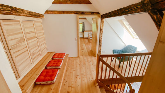 Von der Diele geht es über die wunderschöne Lärchenholzstiege ins Obergeschoss mit Lese- und Spielecke.